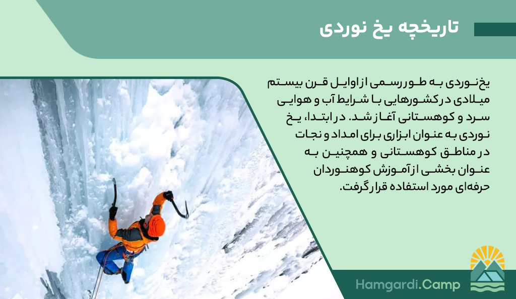 یخنوردی به طور رسمی از اوایل قرن بیستم میلادی در کشورهایی با شرایط آب و هوایی سرد و کوهستانی آغاز شد. در ابتدا، یخنوردی به عنوان ابزاری برای امداد و نجات در مناطق کوهستانی و همچنین به عنوان بخشی از آموزش کوهنوردان حرفهای مورد استفاده قرار گرفت. به مرور زمان، این فعالیت به عنوان یک ورزش مستقل با رقابتهای جهانی شناخته شد. امروزه یخنوردی نه تنها در کوهستانهای طبیعی بلکه در دیوارههای یخزده مصنوعی نیز به صورت یک سرگرمی و چالش برای علاقمندان به ورزشهای افراطی تبدیل شده است. مجله Explore در مورد یخ نوردی چیست؟ می گوید: