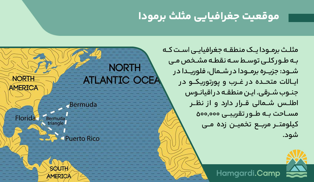 مثلث برمودا یک منطقه جغرافیایی است که به طور کلی توسط سه نقطه مشخص میشود: جزیره برمودا در شمال، فلوریدا در ایالات متحده در غرب و پورتوریکو در جنوب شرقی. این منطقه در اقیانوس اطلس شمالی قرار دارد و از نظر مساحت به طور تقریبی 500,000 کیلومتر مربع تخمین زده میشود. این مثلث، یکی از پرترددترین نواحی دریایی جهان است که بیش از دو میلیون کشتی و هواپیما از آن عبور میکنند، اما همانطور که در ادامه خواهیم دید، داستانهای عجیب و غریب درباره ناپدید شدنها در این ناحیه بسیار رایج است.
