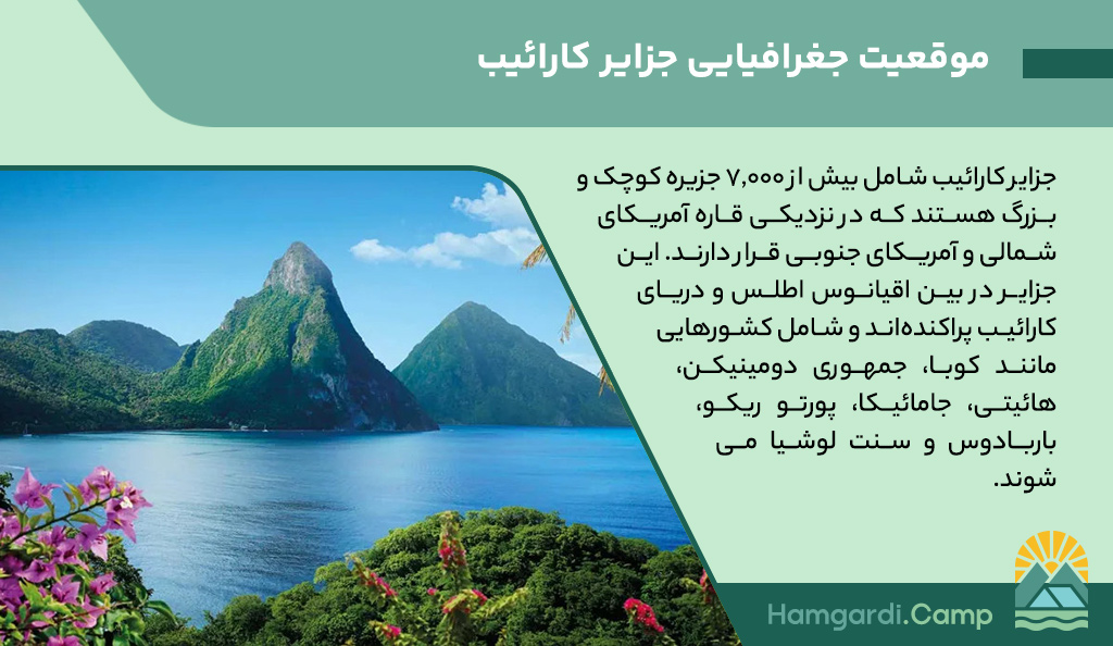جزایر کارائیب شامل بیش از 7,000 جزیره کوچک و بزرگ هستند که در نزدیکی قاره آمریکای شمالی و آمریکای جنوبی قرار دارند. این جزایر در بین اقیانوس اطلس و دریای کارائیب پراکندهاند و شامل کشورهایی مانند کوبا، جمهوری دومینیکن، هائیتی، جامائیکا، پورتو ریکو، باربادوس و سنت لوشیا میشوند. برخی از این جزایر بزرگ هستند و برخی دیگر به صورت جزایر کوچکی در دریای کارائیب پراکندهاند.