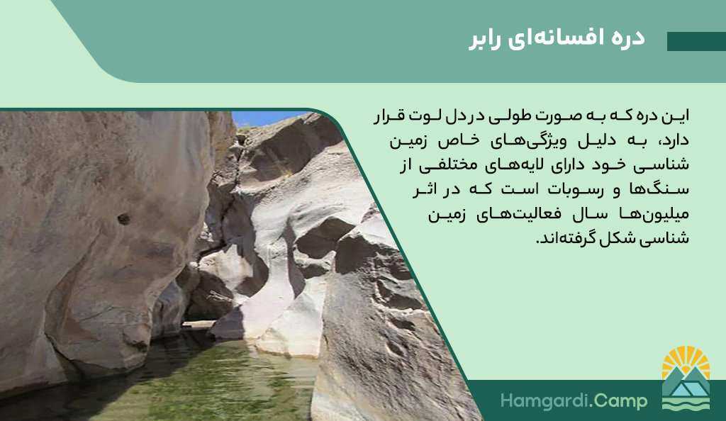 یکی دیگر از ویژگیهای جالب صحرای لوت، دره رابر است که به عنوان یکی از درههای افسانهای این منطقه شناخته میشود. این دره که به صورت طولی در دل لوت قرار دارد، به دلیل ویژگیهای خاص زمینشناسی خود دارای لایههای مختلفی از سنگها و رسوبات است که در اثر میلیونها سال فعالیتهای زمینشناسی شکل گرفتهاند. این صحرا در این بخش زیبایی طبیعی خاصی به خود میگیرد و مکان مناسبی برای گردشگران و علاقهمندان به عکاسی از طبیعت است.