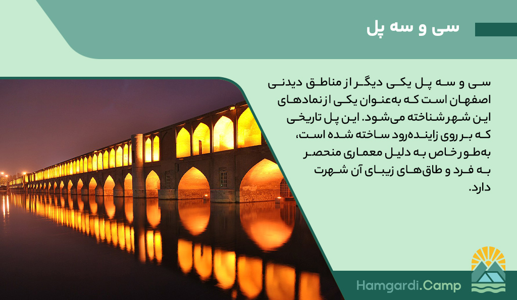 سی و سه پل یکی دیگر از مناطق دیدنی اصفهان است که به‌عنوان یکی از نمادهای این شهر شناخته می‌شود. این پل تاریخی که بر روی زاینده‌رود ساخته شده است، به‌طور خاص به دلیل معماری منحصر به فرد و طاق‌های زیبای آن شهرت دارد. سی و سه پل نه تنها به‌عنوان یک پل تاریخی بلکه به‌عنوان یک جاذبه گردشگری مهم در اصفهان مورد توجه قرار دارد. در هنگام بازدید از سی و سه پل می‌توانید از منظر زیبای رودخانه و اطراف آن لذت ببرید و در فضای تاریخی و رمانتیک آن قدم بزنید.