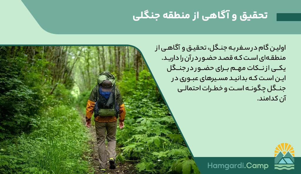 اولین گام در سفر به جنگل، تحقیق و آگاهی از منطقهای است که قصد حضور در آن را دارید. یکی از نکات مهم برای حضور در جنگل این است که بدانید مسیرهای عبوری در جنگل چگونه است و خطرات احتمالی آن کدامند. برخی از جنگلها ممکن است به دلیل شرایط جغرافیایی، آب و هوا یا وجود حیوانات وحشی خطرناک باشند. با کسب اطلاعات دقیق از وضعیت مسیرها، منابع آب و سایر جزئیات، میتوانید سفر ایمنتری داشته باشید.