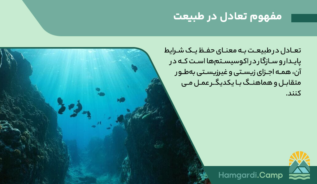 تعادل در طبیعت به معنای حفظ یک شرایط پایدار و سازگار در اکوسیستمها است که در آن، همه اجزای زیستی و غیرزیستی بهطور متقابل و هماهنگ با یکدیگر عمل میکنند. در یک اکوسیستم متعادل، هیچیک از گونهها یا منابع طبیعی بیشازحد تحت فشار قرار نمیگیرند و این وضعیت به گونهای است که تمام موجودات میتوانند به حیات خود ادامه دهند. بهطور سادهتر، تعادل در محیط طبیعیبهنوعی از همزیستی اشاره دارد که در آن، تعاملات پیچیده بین موجودات زنده و محیطزیست به شکلی پایدار و بدون ایجاد اختلال در روند طبیعی ادامه مییابد.