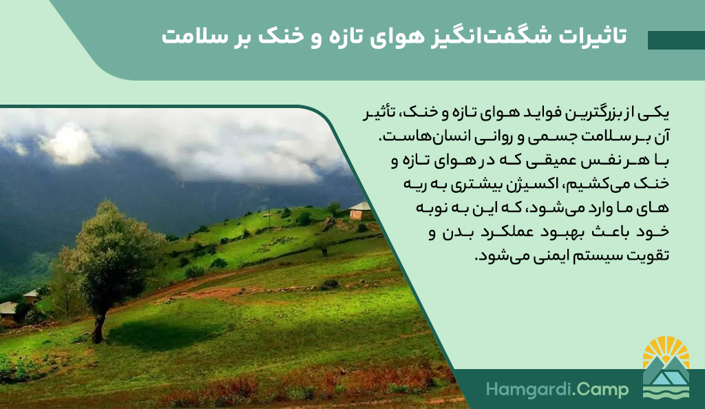 یکی از بزرگترین فواید هوای تازه و خنک، تأثیر آن بر سلامت جسمی و روانی انسانهاست. با هر نفس عمیقی که در هوای تازه و خنک میکشیم، اکسیژن بیشتری به ریههای ما وارد میشود، که این به نوبه خود باعث بهبود عملکرد بدن و تقویت سیستم ایمنی میشود. در دنیای پر از آلایندههای زیستمحیطی، هوای تازه و خنک فرصتی برای تنفس هوای پاک و بدون مواد آلاینده است. این هوای پاک، که بیشتر در مناطق طبیعی و دور از شهرها یافت میشود، باعث بهبود وضعیت سلامت جسمی و روحی میشود.